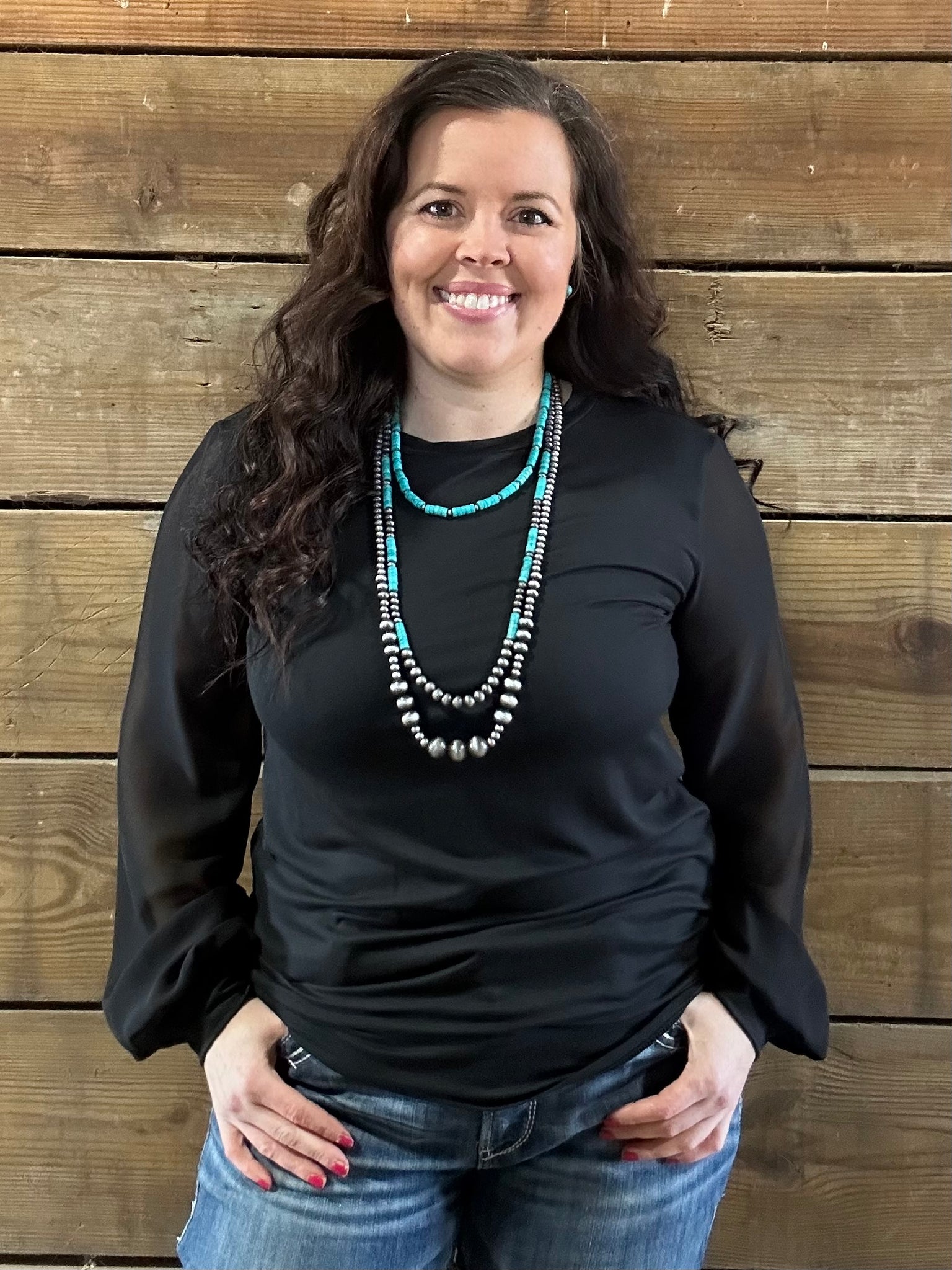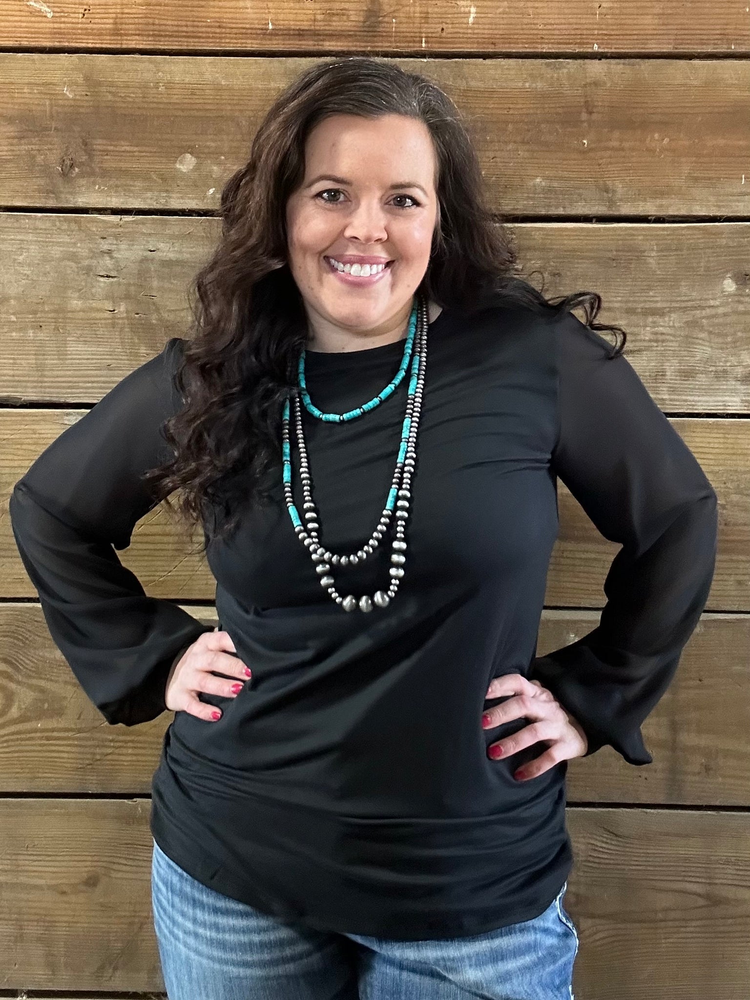 Classy black top with sheer sleeves. Sleeves are cuffed. Perfect for Spring! Dress it up or down