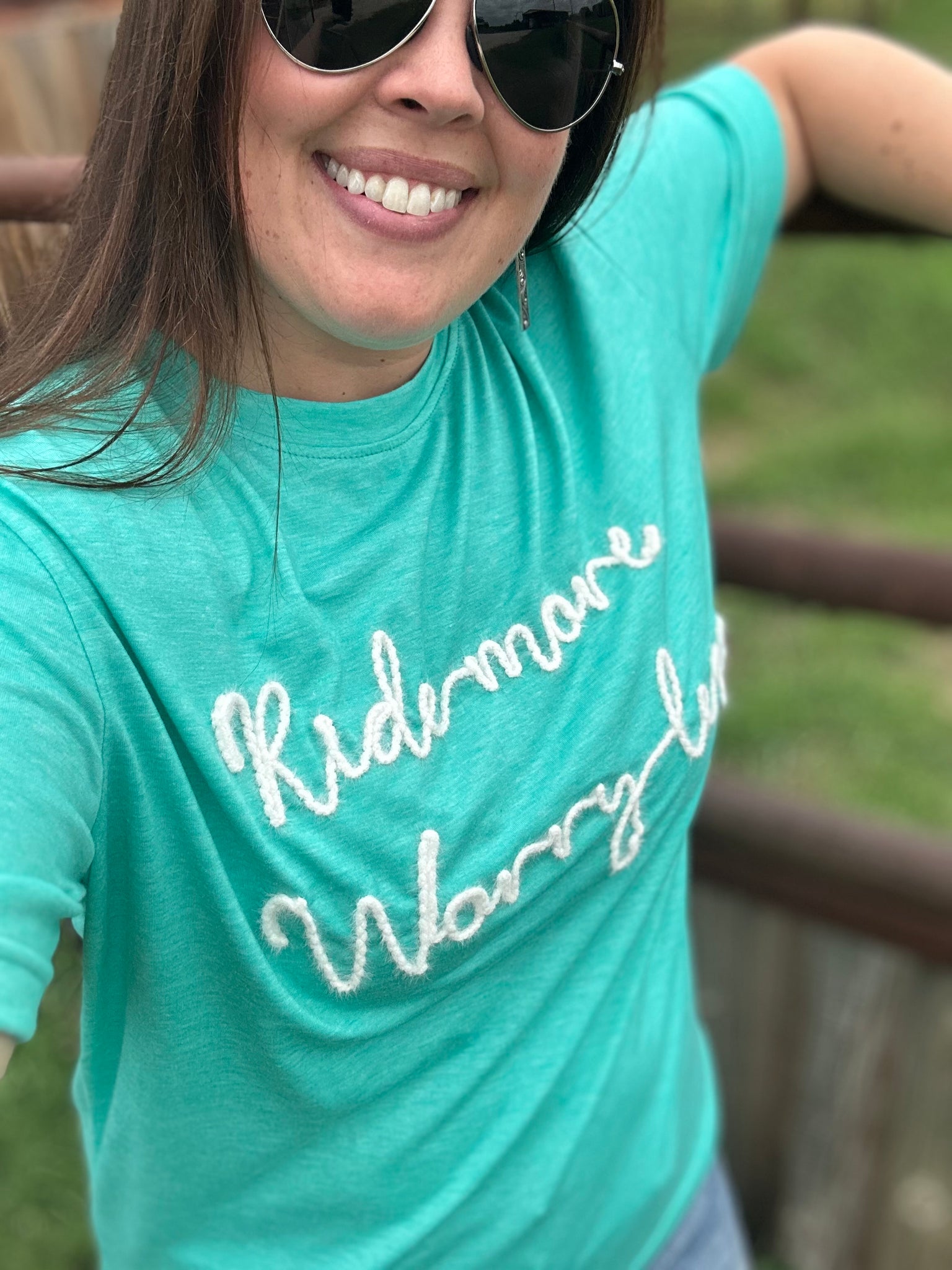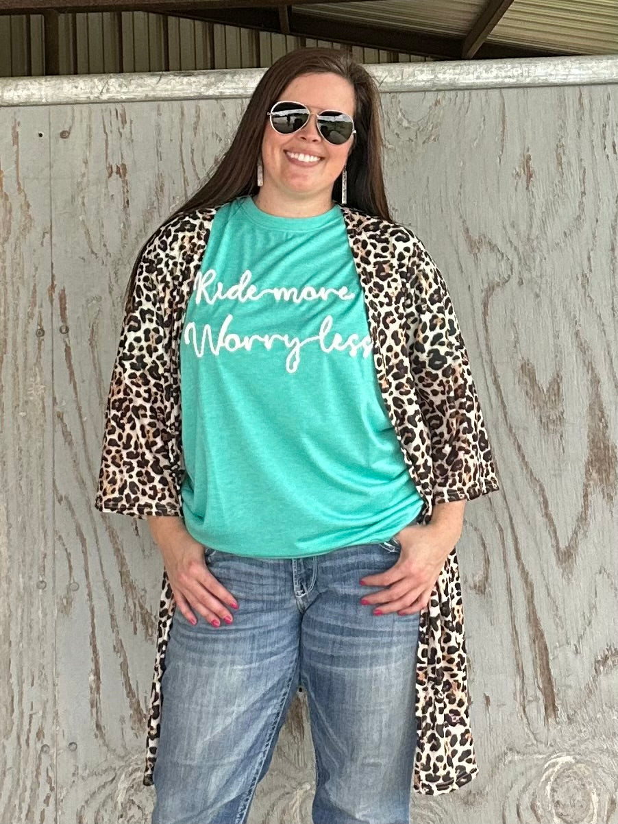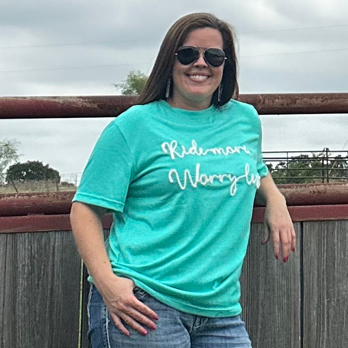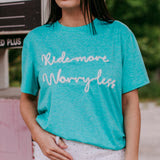 ~ RIDE MORE WORRY LESS ~ this t says it best!!! Just a basic T in a pretty color & the yarn writing gives it a pop for a little "dressier" feel! Comfy Casual is my jam!!!