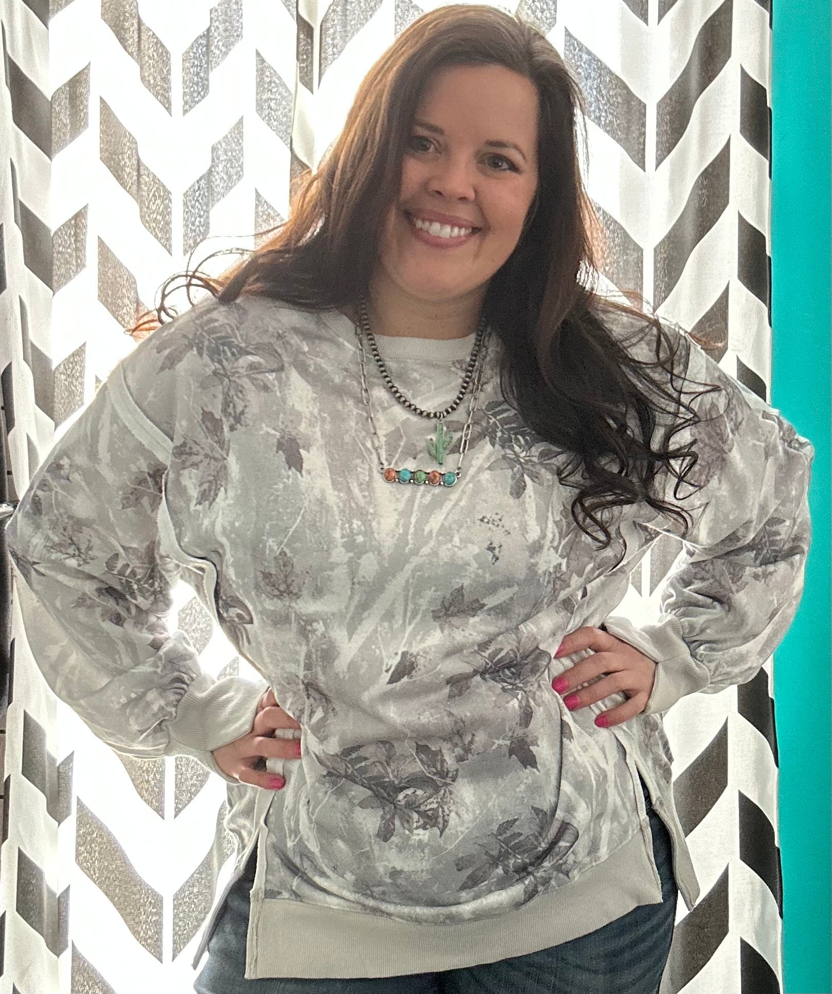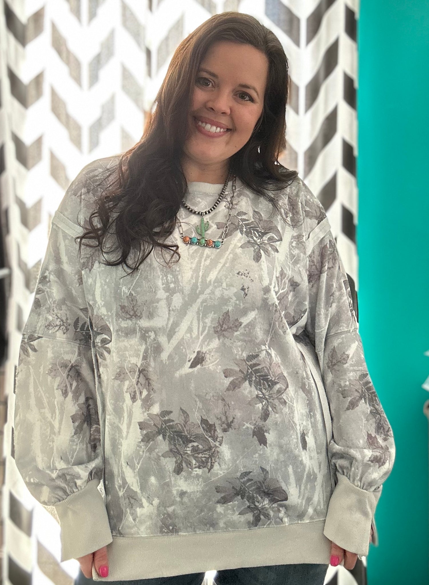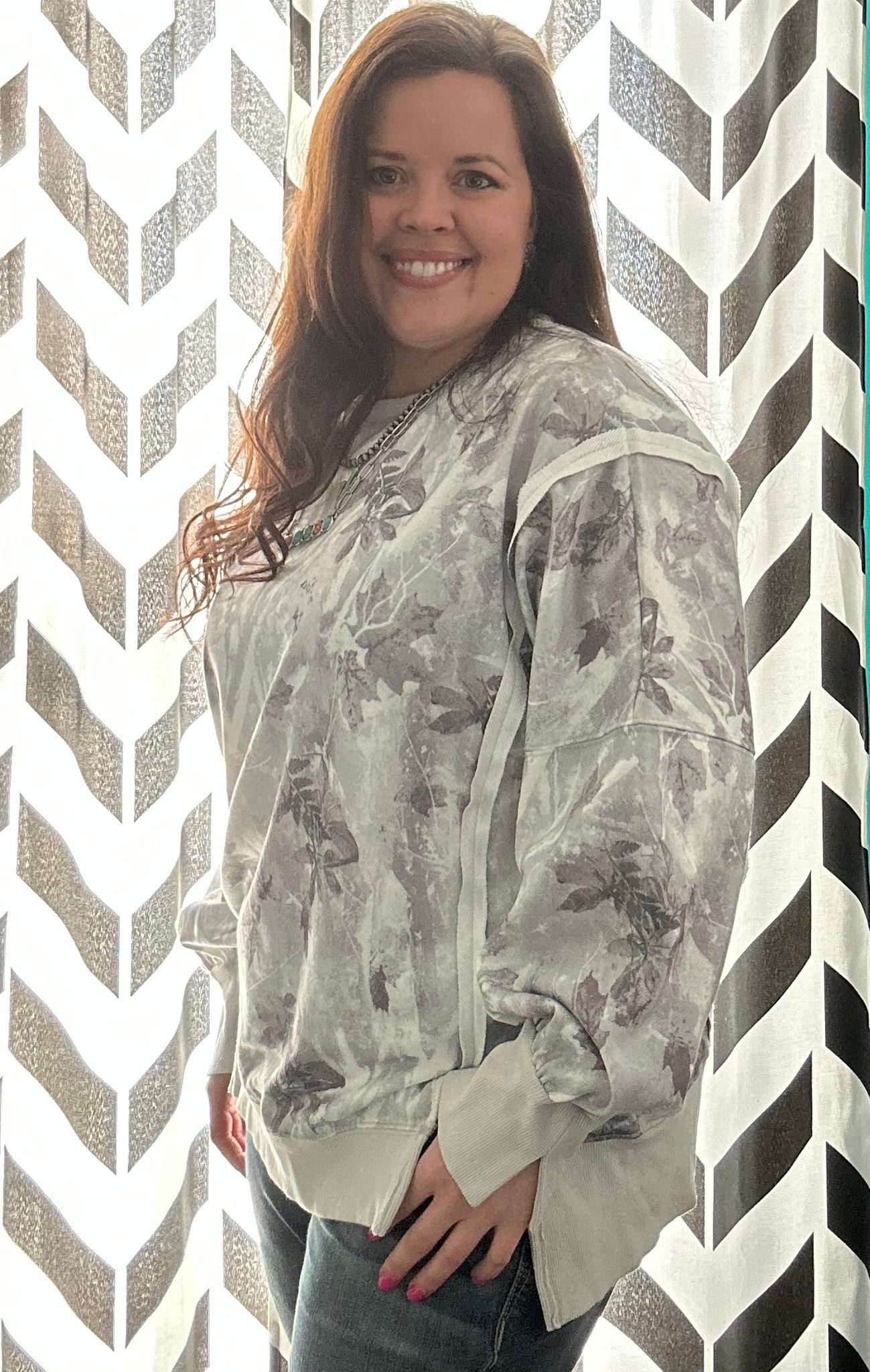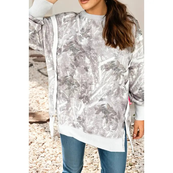 AWESOME oversized fit! Nice Knit materal that DOES NOT CLING. LOVE the detail in the side slit, Slight High/Low & the fun slit in the cuff! ALL THE DETAILS ON THIS ONE! Color: White/Silver Leafy Camo with hints of dark brown/green