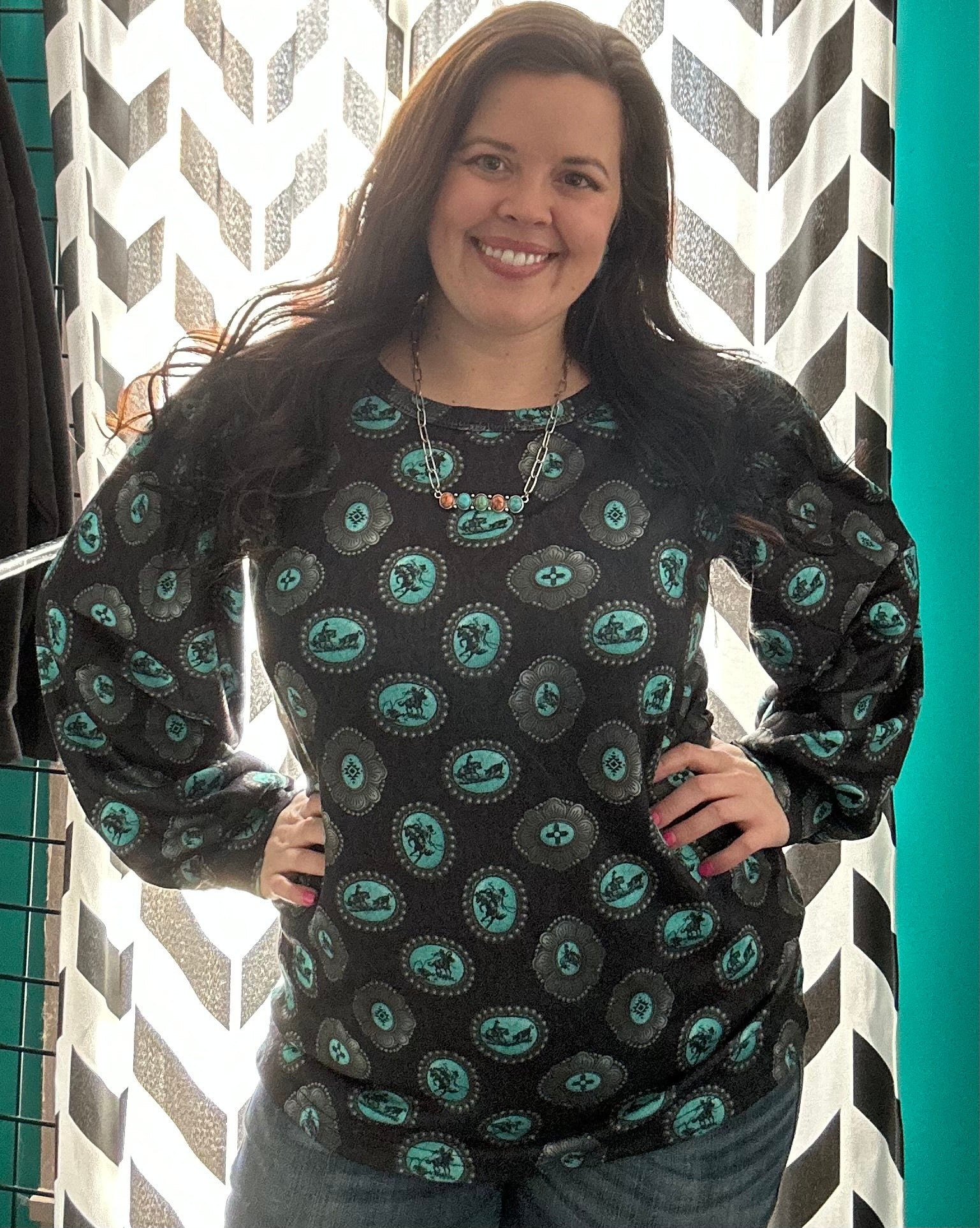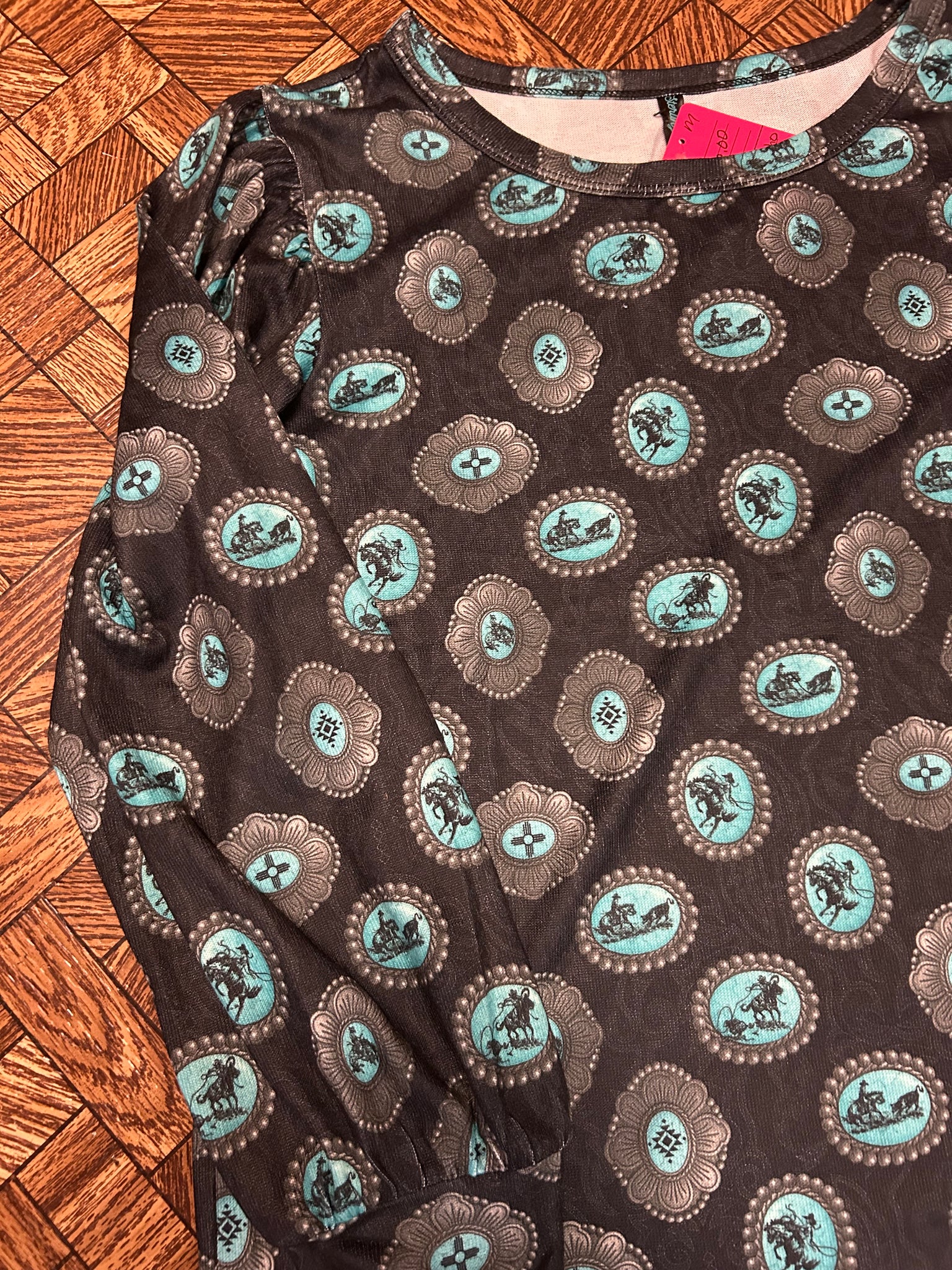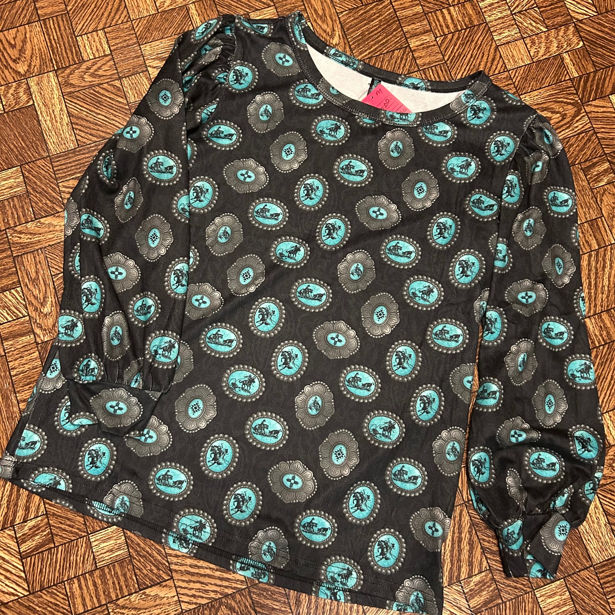 This top will be a go to! Just a simple long sleeve that can be dressed up or down. Silver & Turquoise Buckles with ropers, broncs, cutters & aztec designs.